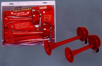118 Decibels-555/655HZ Electric powered, very loud. Two durable red plastic trumpets produce the same powerful sound as an air horn. Only two wires to connect, installs in minutes to vehicle's existing horn system. Ideal for all 12 volt vehicles. Does not require a compressor or air lines. Maintenance free. All needed mounting hardware is included.