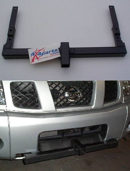 Titan front 2" receiver hitch bolts on to factory holes. You must remove factory tow hooks to mount. You can install our D-Ring for tow point or a multi mount winch system (both sold separately). This receiver hitch is made of 1/4" wall steel with gussetts and 2" square solid mount shanks. Will not work with after-market grille/brush guard. Does not reduce ground clearance. Mounts to 6 frame points using grade 8 hardware. No drilling or welding required. Alterations to the lower bumper will be required on Titans with a metal front bumper overlay. Will interfer with off-road package aluminum skid plate.