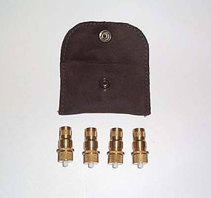 Screws onto tire valve stem and deflates to preset tire pressure suitable to your needs. Has range of 30 to 6 psi. Made brass. Deflates from 35psi to 18 psi in approximately 2.5 minutes. Set of 4 comes complete with leather carrying case.
