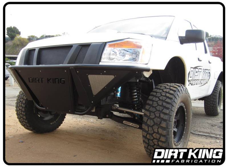 The prerunner bumper is a perfect addition to any off-road Titan. It gives the front end that finishing touch as well as providing a strong structure to withstand the punishment seen in off-roading. The bumper is CAD designed and constructed with DOM tubing. The frame horns for the bumper are built with 1/8” and 3/16” plate to ensure maximum strength. We offer several options allowing you to customize it to your preferences. The standard bumper comes powder coated black with an aluminum Dirt King skid plate. This bumper bolts into the factory holes on the frame once the crossmember is cut and removed.