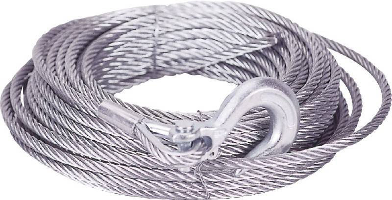 - 3/8" x 100' galvanized aircraft cable with replaceable hook.