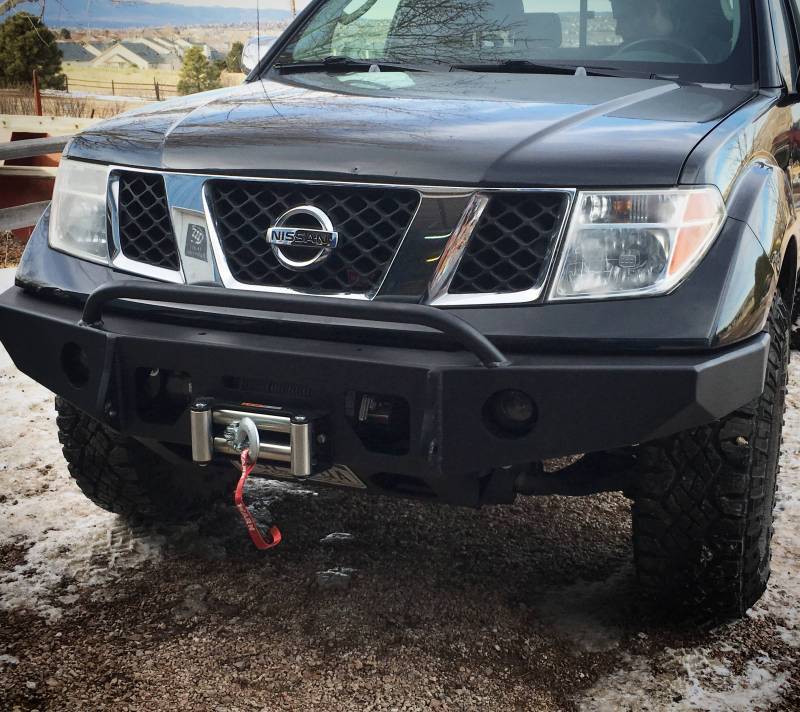 The 2005 to 2018 and pro4x FRONTIER Aluminum Bumper is now available! Built tough to be abused, this bumper can handle the harshest off road terrains and was built with strength and function in mind. Using only the highest grade 5052-H34 Aluminum, the 1/4" main body, 3/8" mounting plates, and hardened and sleeved integrated recovery points make this a very strong and very light weight bumper (only 55 lbs) for your Xterra. Similar in strength to a Steel version at about 1/3rd the weight, it is the perfect choice for overland and everyday use. The light weight Aluminum series bumpers provide the protection you need without the negative effects on your fuel economy and suspension components of a heavy steel bumper. Yes you can run this bumper without suspension modifications. The recessed winch mount accepts most winches up to 9500lbs with standard 10"x4.5" mounting pattern and a non-integrated solenoid. Synthetic line winches strongly suggested with our Aluminum series bumpers.