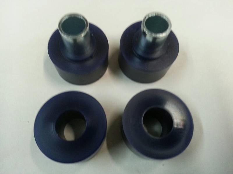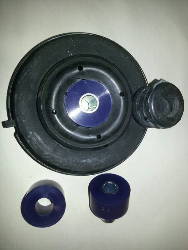 - Front upper shock bushings can be used with your stock shocks or aftermarket Bilstein shocks as well. You must cut a hole like shown in picture in the upper coil bucket rubber insulator to install.