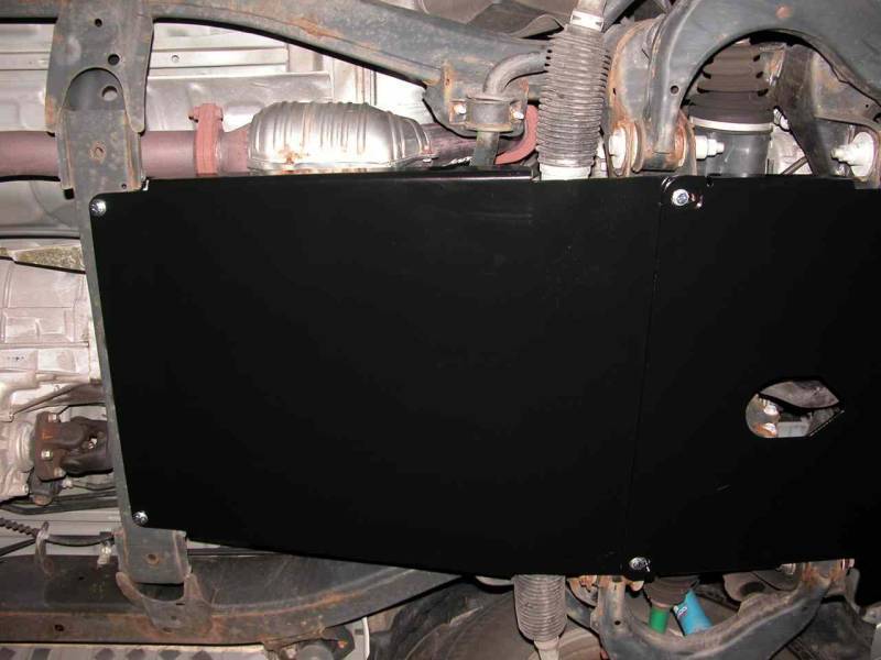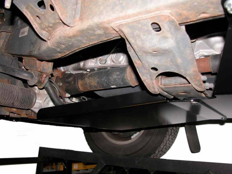 - Transmission Skid Plate protects your transmission and steering rack while filling the gap between our Front Skid Plate and our Transfer Case Skid Plate. This skid plate is made from laser-cut 3/16" thick steel that is CNC folded for consistent quality and fit. Then it's finished in an environmentally-friendly, and durable, black powder coating. Mounted solidly to the truck's frame, installation does NOT require any drilling. All hardware and instructions are included. This Transmission Skid Plate is designed to fit vehicles with a crossmember spacing of about 23".