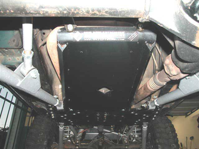 Made from 1/4" thick steel and reinforced with 1/4" angle to provide beefy protection for your engine's oil pan and your transmission. Installation is quick and easy and only requires drilling of two holes to attach the rear of our skid plate to whatever transfer case skid plate you are using. There is even an oil drain hole so that you can perform your regular maintenance without removing the skid plate.