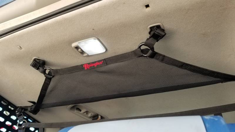 - Inexpensive and makes an amazing amount of storage in an unused location and uses OEM mounts in the ceiling.