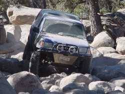 1998 Frontier "Blue Meany Gator Killer" - V6 axles with 5.14 gears, ARB lockers front and rear, 3.92:1 Tcase gears, gouged up Skid Row skids, bent Beefy James sliders, custom front and rear .120 wall rock rashed bumpers, 3" AC lift, BDS rear springs with