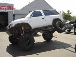 Solid axel Pahtfinder with 38.5 SX's and 12.5 inches of lift. 5.29 richmond gears and Detroit locker in rear with Detroit Truetrack up front. Completely custom linked front and rear suspension with loads of travel Dual batteries running a 8500lb winc