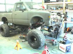 This is my little 84 Nissan. As you can tell its still under construction.I did the SAS already with D44 F/R, getting ready to bolt a 305 and a t350 in next. Right now its sittin' on 33's soon to be 38's or 39.5's, not sure what size that I want. I'll pos