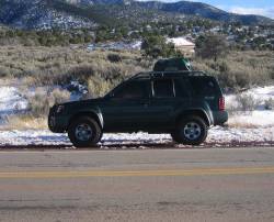2000 X-Terra Se 4x4. 3" AC suspension lift w/ Ranscho RS 9000X shocks (awesome), 32" x 12" BF Goodrich All Terrain T/A K/O's, HKS intake, Magnaflow exhaust, Manik brushguards (tail and front), badass 150W foglights (AC), 10" JL sub