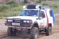 A german Nissan Y720! 84 720 with Z24 engine, 38 Weber Carb, SAS with Nissan Patrol front axle and breaks,spring over, Hardbody power steering, Diesel-diffs(4,88.1),actually with 31x10,5, 33 are in work. It has no body lift! Custom made camper.